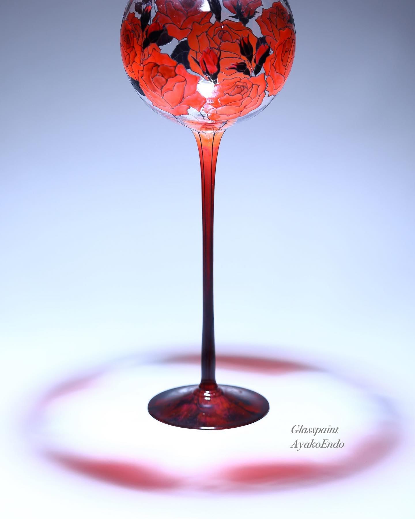 薔薇の雫🌹 透明なガラス高さ63㎝のワイングラス🍷にフランス ペベオの透明な絵の具ヴィトレア160でグラスペイント 春に出版される書籍に掲載いたします その後、東京ビッグサイトで開かれる日…